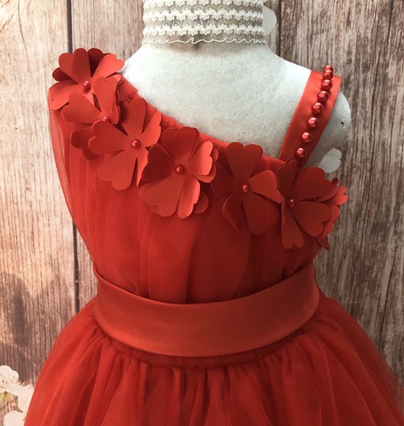 Vestido de Bata Vermelho Coral no Atacado em Tecido de Organza Brilhante com Manga Curta e Flores Bordadas Estilo Formal para Festa Infantil de Véspera de Natal